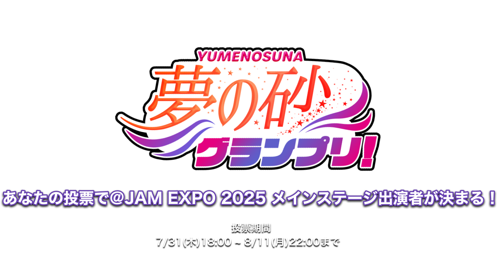 ※対象となる投稿動画に関しては、「夢の砂」のパフォーマンスをタイムライン上で見られる動画として載せていて、かつハッシュタグ「#夢の砂グランプリ2025」を付けて投稿しているものになります。※RT数の測定に関しては、初めに動画を投稿した1ツイートのRT数のみ換算。第三者などの引用ツイートのRT数などは数に換算されません。※本ページからの投票には@JAM会員登録が必要です。※投票後の内容の変更はできませんので予めご了承ください。